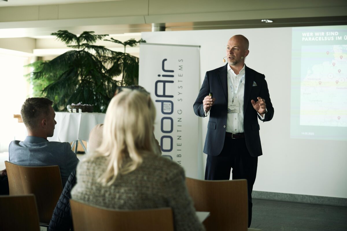 Bei traumhaftem Wetter gab Philipp Fröschle spannende Einblicke aus unternehmerischer Sicht der Paracelsus Kliniken, Monika Kritzmöller zeigte eindrucksvoll, wie HealingArchitecture das Verhalten von Patient:innen positiv beeinflussen kann.